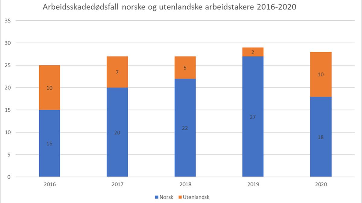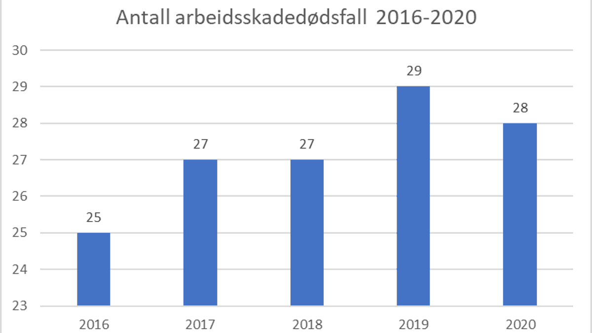 Foreløpige tall fra Arbeidstilsynet viser 28 arbeidsskadedødsfall i det landbaserte arbeidslivet i 2020, fordelt på 27 ulykker. Til tross for et annerledes år, der koronapandemien har preget arbeidslivet i stor grad, holder antall arbeidsskadedødsfall seg på samme nivå som vi har sett de senere årene.