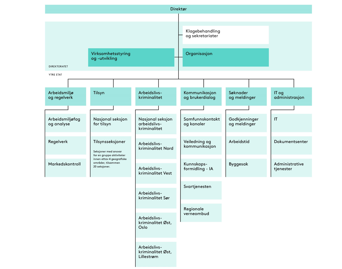Arbeidstilsynet består av et direktorat, og en ytre etat med seks avdelinger.