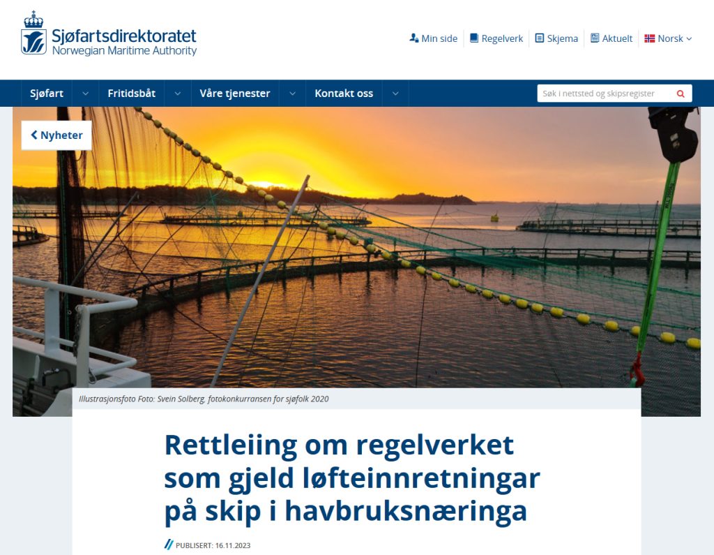 Rettleiing om regelverket som gjeld løfteinnretningar på skip i havbruksnæringa