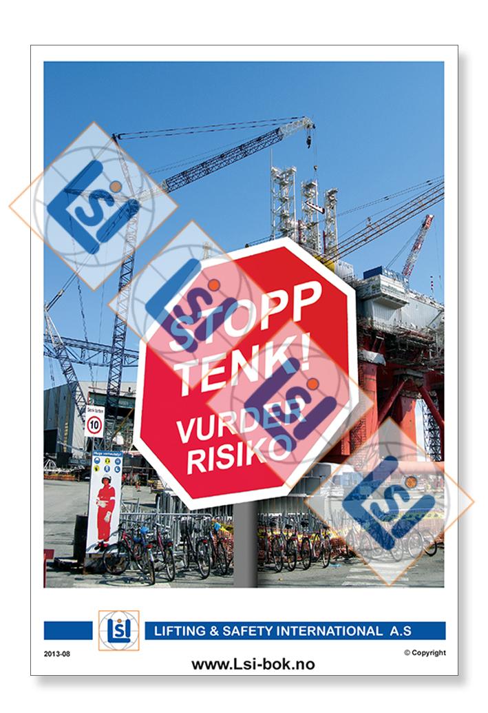 Plakat i kraftig laminert plast, som viser et bilde fra en industribedrift med løfteoperasjon i bakgrunnen og et stoppskilt i forgrunnen med teksten: STOPP, TENK, VURDER RISIKO.