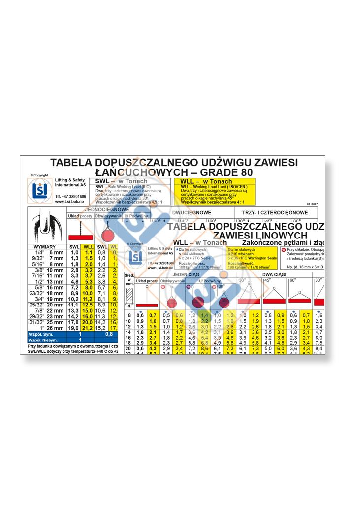 Løftetabell på Polsk språk for Kjetting og ståltaustropper, med angivelse av løftekapasiteter ved ulik bruk, arbeidsvinkler, antall parter dimensjoner og anleggsdiametre.
