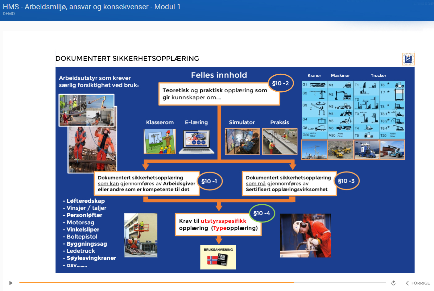 Velg DEMO på vårt E-læringskurs og lær om kravet til utstyrsspesifikk opplæring om ble tydeliggjort i 2016 .